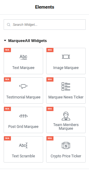 - Open the Elementor editor and search for “MarqueeAll” or “Marquee”.